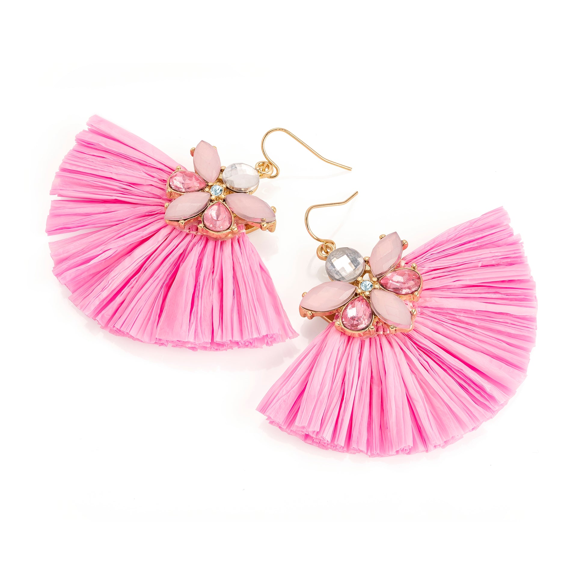 These handcrafted earrings are designed to make a statement with their unique fan shape and elegant gemstone embellishments. The combination of raffia and sparkling stones creates a perfect balance of boho and elegance, making them a must-have for your jewelry collection.