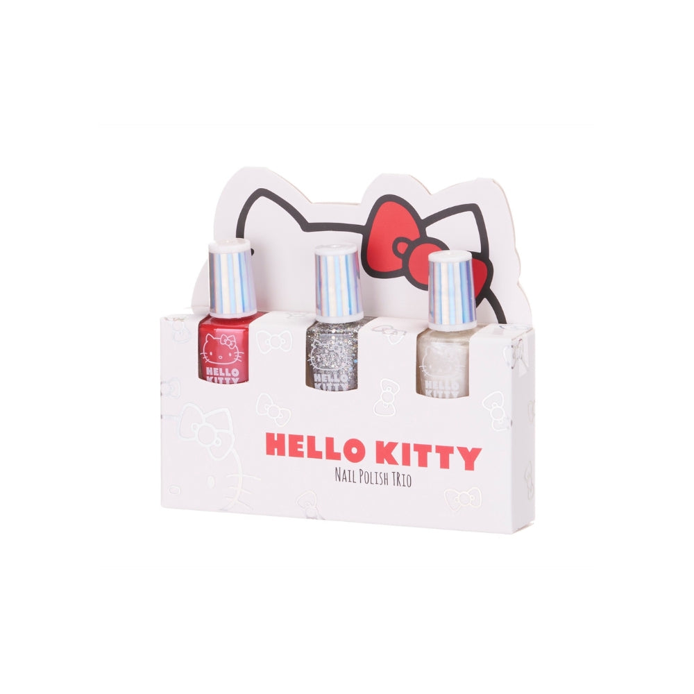 Hello Kitty Nail Polish Trio in Red, White and Silver Glitter. Presented in a lovely gift box. Hello Kitty Nail Polish Trio is the perfect way to add a pop of color to your nails. This trio includes red, white, and silver glitter polishes, each with a unique and vibrant shade. With these high-quality polishes, you'll be sure to achieve a flawless manicure every time. Plus, the trio is beautifully packaged in a lovely gift box, making it a great gift for any Hello Kitty fan or nail polish lover.