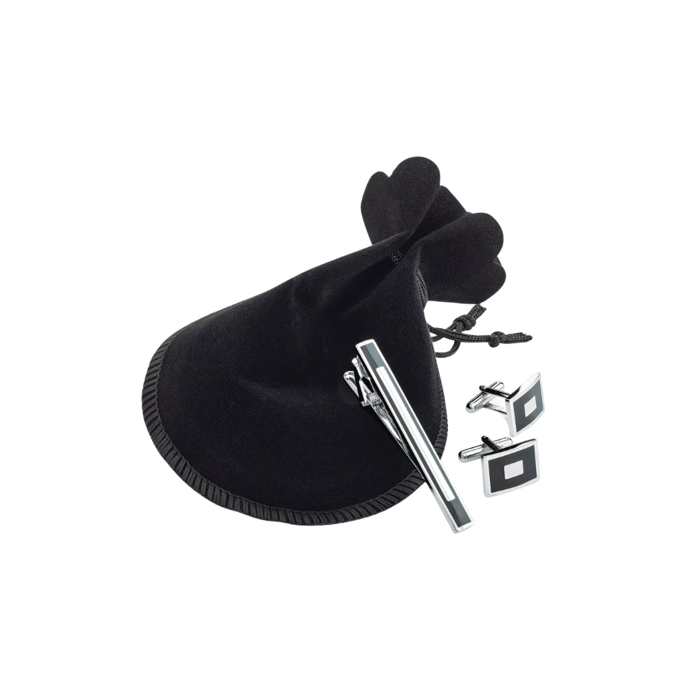 Men’s Cufflinks & Tie Pin Set Black & Silver in Elegant Velvet Pouch