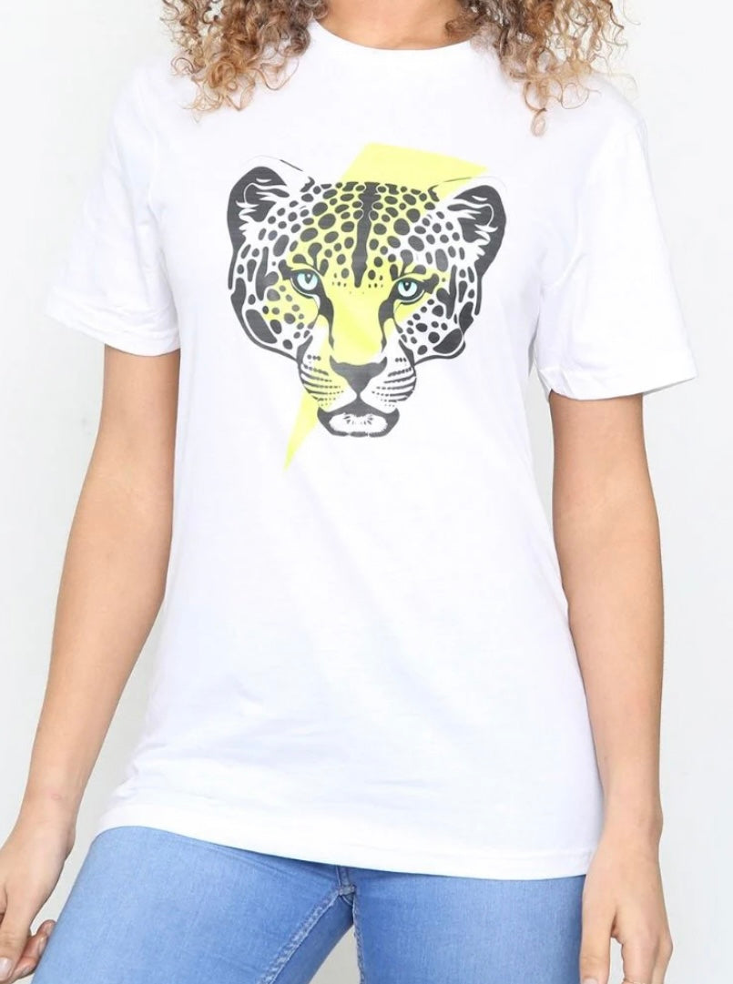 Take a walk on the wild side with this leopard print t-shirt featuring a neon lightning bolt. Made from soft and comfortable ringspun pre-shrunk cotton jersey, this tee boasts a round neckline, taped neck and shoulders, and twin needle sleeve, bottom hem, and neckline for added durability. Embrace your adventurous spirit in this 24.4"/62cm long t-shirt made from 100% cotton and proudly crafted in the UK.